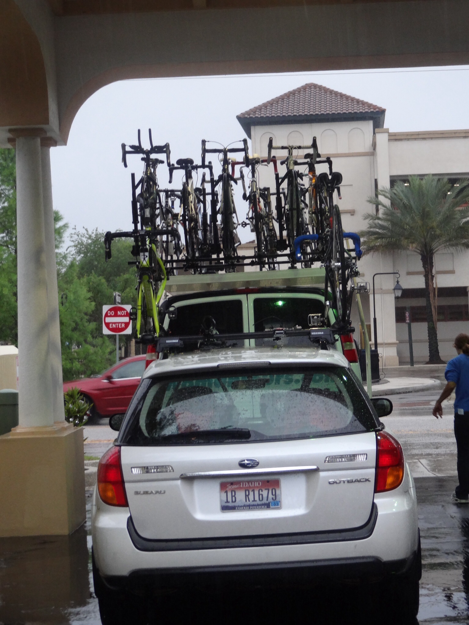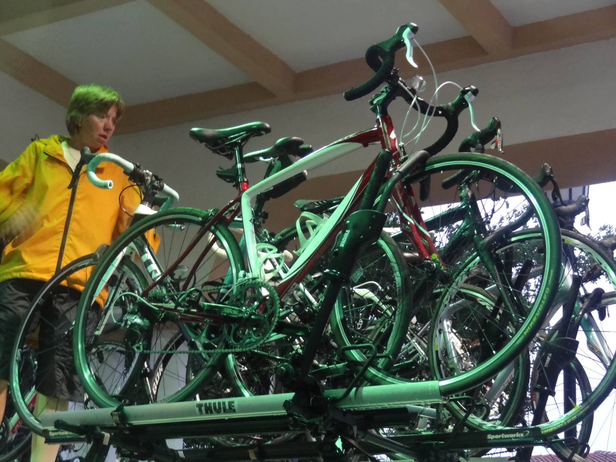 Early Friday morning, I looked out the window and was greeted by a sensational downpour. I was so thankful that I did not have to put on my bike clothes and ride out into it – it proved to be quite a storm. I did have to go out – but for a different task. The handover of Sweet Ruby to Carol for a ride to the bike shop for packing and transport home. There were 13 bikes that were to be shipped home, and about a dozen riders hitching a ride to the airport. The area in front of lobby was busy and unfortunately for anyone trying to sleep – was a bit noisy.
